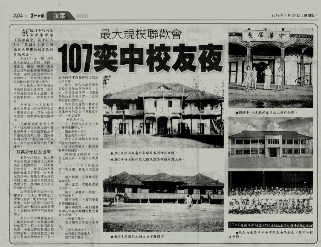 我們非常非常高興, 兒子及兒媳在 2012 年十月由美國帶我倆回去汶耒馬耒奕參加在奕中母校舉辦的校友联歡會.當天,在早茶及晩会里,我們見到了數十年沒見的老同學和老朋友, 吃到了多年沒吃的熱帶美食. 最令我們忘不了的是, 和同學們的[話舊]. 當天,一切的一切,都永遠留在我們甜蜜的記憶里!這樣的快樂時光,足可説是人生一樂