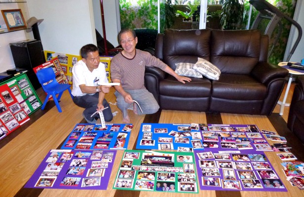 Looking through the reunion photos, I was suddenly flooded with many memories and emotions of the months leading up to the event. Early 2012, We were in Australia preparing to go back to Brunei for 6 months to help out in the family business – my Dad would always talk to me about the upcoming reunion. He was very excited to tell me about all the people coming from all over the world and he would always brainstorm ideas to raise money for KBCHMS. He wanted to create a display of old coins, old stamps, old cameras in a cabinet so he asked me to source some frames, photo adhesive and come up with a solution to display the photo boards. He asked all his friends and family to look through their albums and share old photos. When we arrived in Brunei, we started editing photos, getting them printed and ready to be grouped. I was very amused to see my Dad creating his first few photo boards and once he knew they would work, he would go to all the Hua Ho stores to buy the fluted boards.