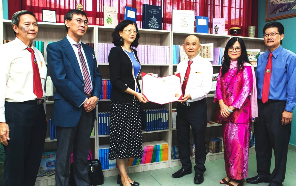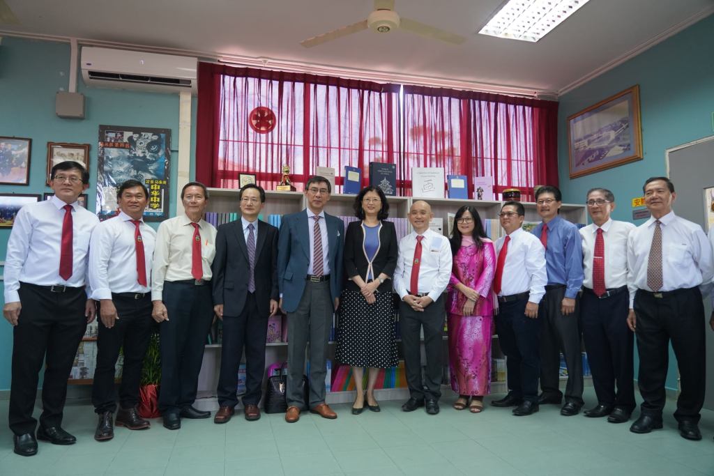中国驻汶莱特命全权大使于红阁下莅临奕中,代表使馆向本校捐赠307册图书及影视资料之余,也在董事长劉小源及校長張贵娟一行人陪同下参观甫建竣的大圣人文楼,了解本校新式图书馆的兴建计划,处处流露出她对汶莱华文教育发展的关心和支持.