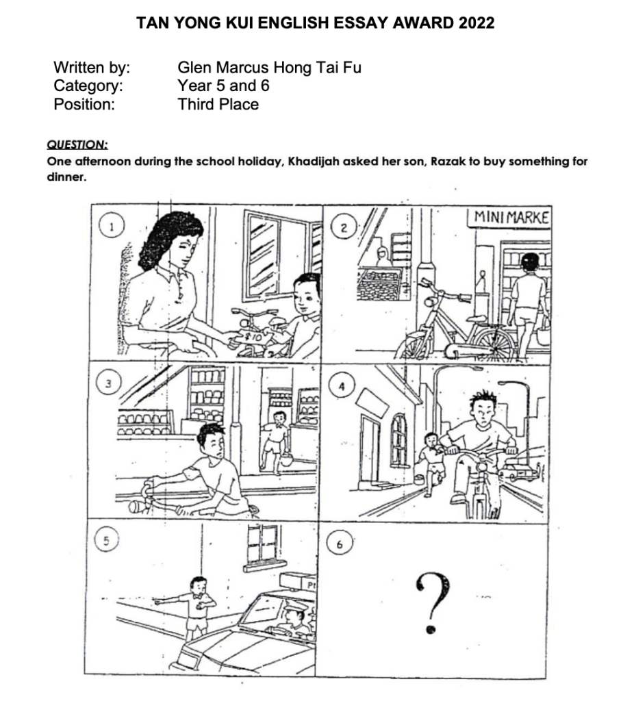 We send our children to school to learn ABCs to learn to read and to write. The most wonderful is when they write stories of their own imagination. It is amazing what their imaginations will create and how they will weave single words together to tell a marvellous story. It is with joy and pride that we start to share stories written by our younger generation – using just a simple pictorial prompt, the student has to use his imagination to tell us his interpretation of events. Thank you to Mr Tan Yong Kui for being the patron of this award to encourage young writers.