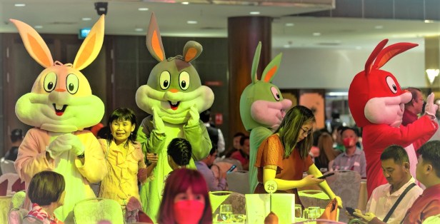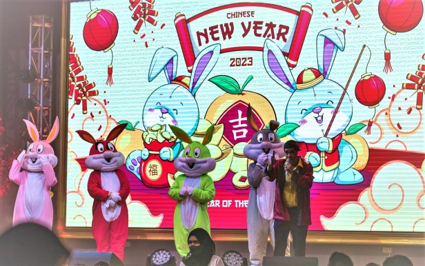 當晚,主辦單位 把會場佈置得喜氣洋洋,百多隻體型各異、各種姿態的福兔充滿全場,牠們張著可愛的大眼睛,笑容可掬,和大家送走虎年,迎接吉祥喜氣的兔年。