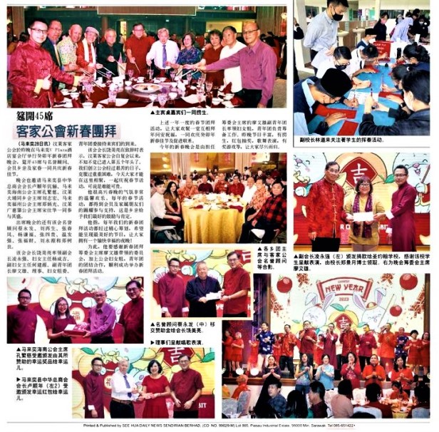 晚會設有美味佳餚,歌唱,舞蹈,有獎游戲,幸運紅包抽獎等節目;其中兩支民族舞蹈是馬來奕聖約翰學校免費提供,所以客家公會特捐贈教育基金給該校。理事會員們帶來精彩的表演,大家掌聲雷動 ,場面熱鬧.