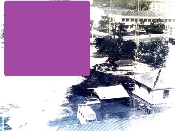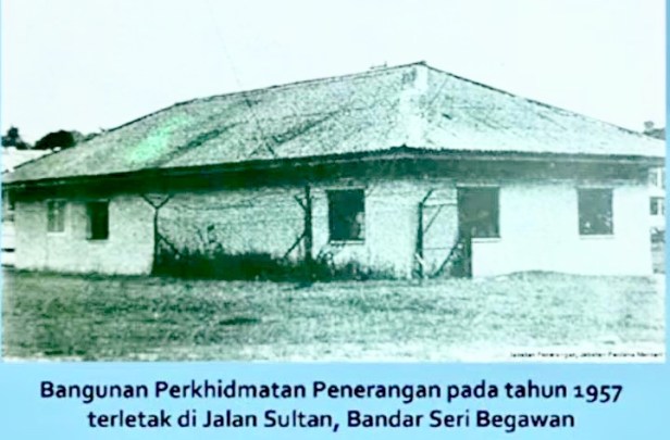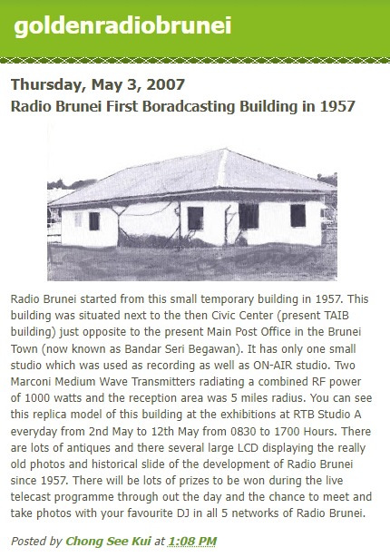 Radio Brunei started from this small temporary building in 1957. It was situated next to the then Civic Centre (present TAIB building), just opposite the Main Post Office in Brunei Town (now known as Bandar Seri Begawan).