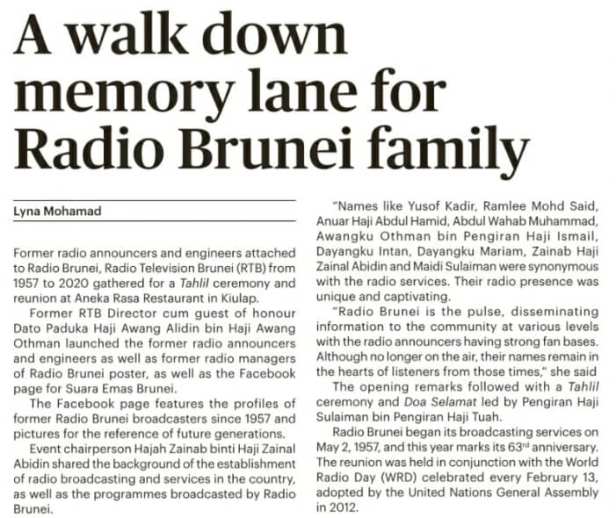 Hari ini, 2 Mei 2025, genap 68 Tahun Radio Brunei. Apabila DJ pertama, Dayangku Intan, menghidupkan mikrofon studio dan mengumumkan “Ini lah Radio Brunei”, suaranya bergema dengan keterujaan di seluruh negara. Ini adalah permulaan perjalanan yang menyaksikan Radio Brunei memainkan peranan penting dalam membentuk identiti nasional kita bersama. Ia menyediakan berita bersindiket, sukan dan muzik, menjadi sebahagian daripada kehidupan harian kita. Bagi kebanyakan negara, radio ialah cara yang paling pantas dan boleh dipercayai untuk menerima kemas kini tentang acara kebangsaan dan dunia. Malah pada hari ini, ia kekal sebagai bentuk komunikasi massa yang relevan dan salah satu daripada beberapa perkhidmatan percuma yang tersedia untuk sesiapa sahaja yang mempunyai penerima. Untuk menjadikan perkhidmatan ini lebih mudah diakses, salah satu firma komersial telah diberi kuasa untuk mengimport penerima radio transistor mudah alih, menjual kepada orang ramai secara ansuran @$5 sebulan. (@Google translation)